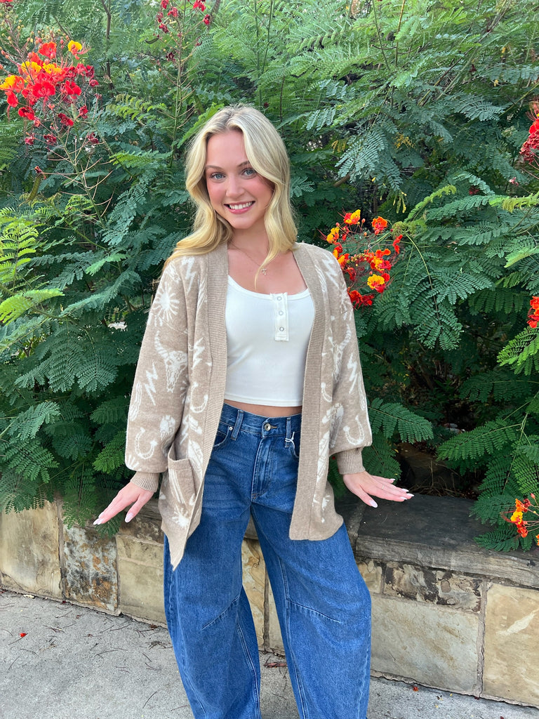Oversized sweater with cactus, boots, horseshoes and sunshine.